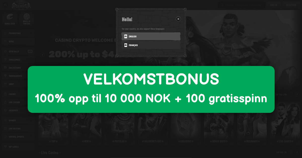 For nye casinospillere oppgis en velkomstpakke som: 100% opptil 5 000 NOK + 200 gratis spinn samt 1 Bonus Crab. For sport oppgis 100% opptil 2 000 NOK. Tilbud kan endres, og detaljer følger alltid gjeldende kampanjeside. Gratis spinn (free spins) krediteres vanligvis i puljer, og spilltittel(er) og verdi per spinn står i bonusvilkårene.